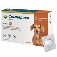 Жевательная таблетка со вкусом печени, является препаратом нового поколения для защиты собак от блох и клещей. Основным действующим веществом является сароланер (sarolaner), который абсолютно безопасен для животного. Благодаря своей эффективности, уже через 8 часов после применения препарата, салоранер проявляет активность против всех видов блох паразитирующих на собаках и через 12 часов препарат проявляет действие на клещей. Препарат сохраняет свое действие на протяжении 35 дней (5 недель). Следует отметить, что Симпарика на 100% уничтожает все виды клещей, включая иксодовых, а также вызывает гибель всех видов блох, на всех стадиях развития, обеспечивая защиту места обитания питомца от заражения яйцами и личинками. Дозировка: 10 мг - одна таблетка для собак массой тела от 2,5-5 кг; 20 мг - одна таблетка для собак массой тела от 5-10 кг; 40 мг - одна таблетка для собак массой тела от 10-20 кг; 80 мг - одна таблетка для собак массой тела от 20-40 кг; 120 мг - одна таблетка для собак массой тела от 40-60 кг. сароланер 20 мг, а также вспомогательные вещества: лактозы моногидрат, карбоксиметил-крахмал натрия, кремния диоксид коллоидный, магния стеарат и вкусоароматическую гранулированную основу.